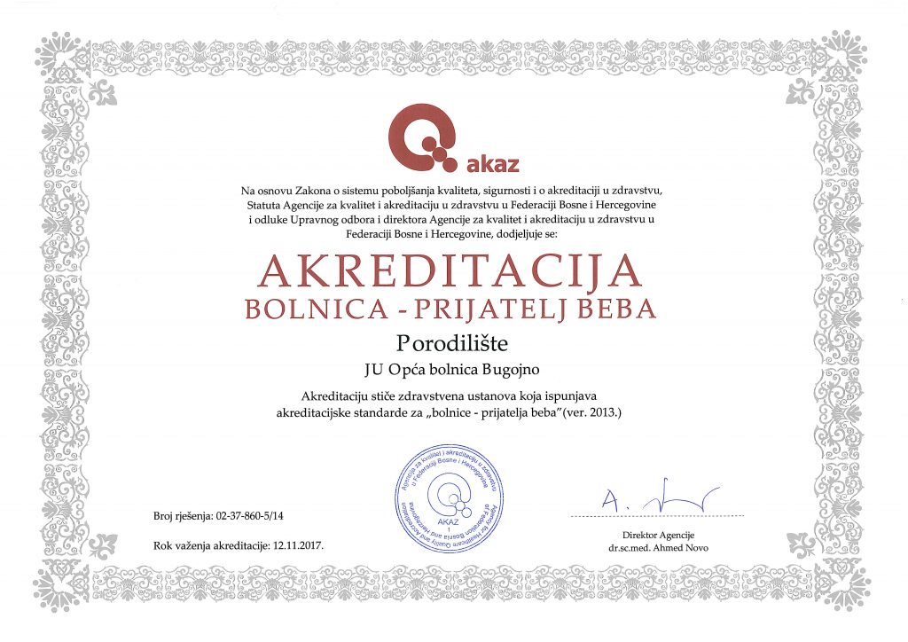 Fokusirane akreditacije ‘Bolnica-prijatelj beba’ s trajanjem od tri godine dobili su Klinika za ginekologiju i akušerstvo Kantonalne bolnice Zenica, Klinika za ginekologiju i akušerstvo Hrvatske bolnice „Dr. fra Mato Nikolić“ Nova Bila, Odjel za ženske bolesti i porode Županijske bolnice “Dr. fra Mihovil Sučić” Livno, Ginekološki odjel Opće bolnice “Dr Mustafa Beganović” Gračanica, Ginekološko-porođajna služba JU Bolnice Travnik, Medicinski odjel za ginekologiju i akušerstvo Kantonalne bolnice „Dr. Irfan Ljubijankić” Bihać, Odjel za ginekologiju i porodništvo Sveučilišne kliničke bolnice Mostar, Centar za majku i dijete Regionalnog medicinskog centra “Dr.Safet Mujić” Mostar i Porodilište Opće bolnice Bugojno, priopćeno je iz Agencije za kvalitetu i akreditaciju u zdravstvu u Federaciji Bosne i Hercegovine.